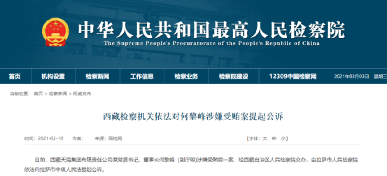 2021年2月10日,最高人民檢察院官網發布消息:西藏天海集團有限責任公司原黨委書記、董事長何黎峰(副廳級)涉嫌受賄罪一案,經西藏自治區人民檢察院交辦,由拉薩市人民檢察院依法向拉薩市中級人民法提起公訴。