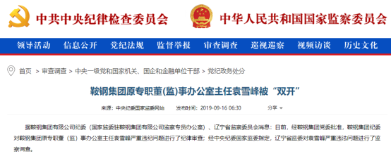 2019年9月16日,中央紀委國家監委網站消息,《鞍鋼集團原專職董(監)事辦公室主任袁雪峰被“雙開”》 。