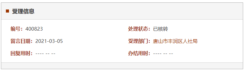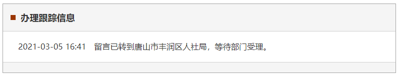 此留言處理狀態(tài)為已核轉(zhuǎn),辦理跟蹤信息顯示,2021年3月5日 16:41留言已轉(zhuǎn)到唐山市豐潤(rùn)區(qū)人社局,等待部門受理。