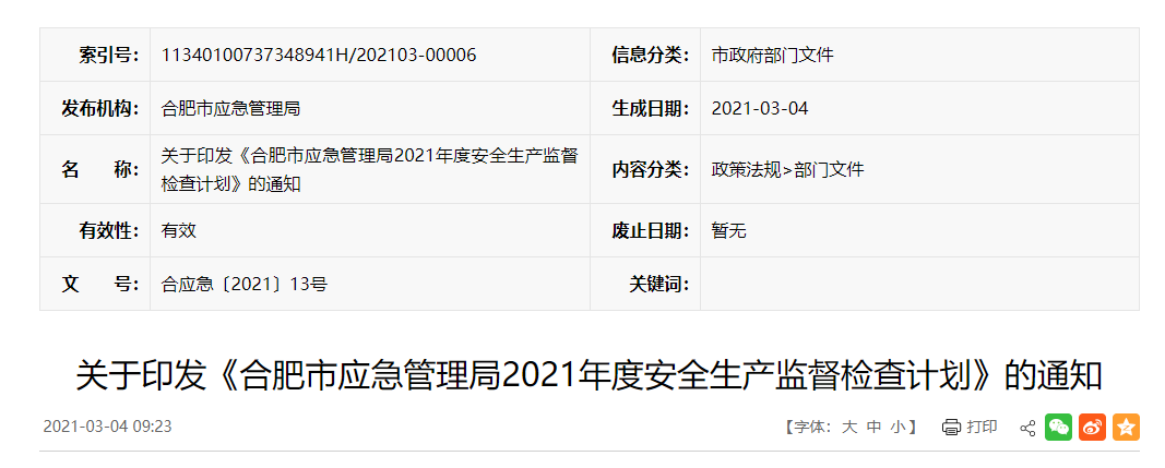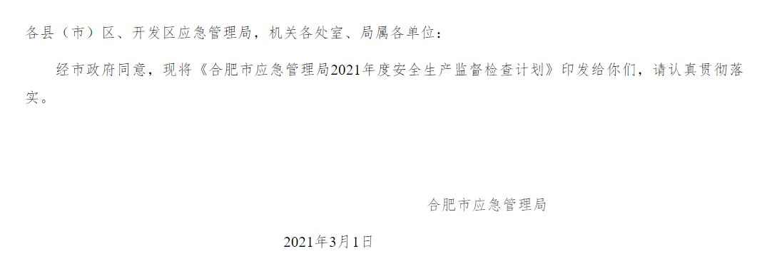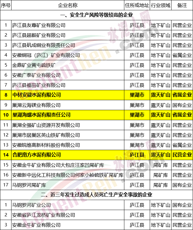 3月4日,安徽省合肥市人民政府網站發布《合肥市應急管理局2021年度安全生產監督檢查計劃》,將重點檢查20家安全生產風險等級較高的非煤礦山企業(10家地下礦山、7家露天礦山和3家尾礦庫)。其中包括中材安徽水泥有限公司、巢湖海螺水泥有限責任公司、合肥南方水泥有限公司等企業的露天礦山。
