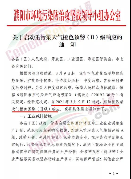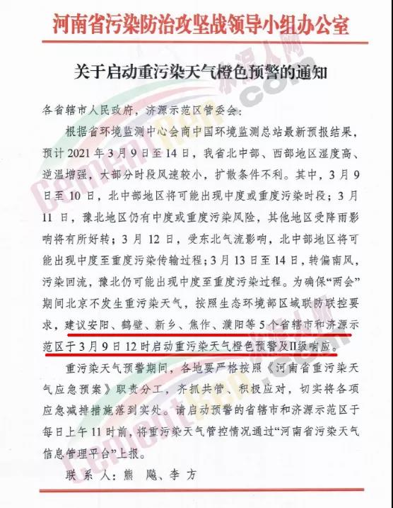 濮陽(yáng)市環(huán)境污染防治攻堅(jiān)戰(zhàn)領(lǐng)導(dǎo)小組辦公室發(fā)布《關(guān)于啟動(dòng)重污染天氣橙色預(yù)警(Ⅱ)級(jí)響應(yīng)的通知》自2021年3月9日12時(shí)起,啟動(dòng)重污染天氣橙色預(yù)警(Ⅱ級(jí))響應(yīng)。