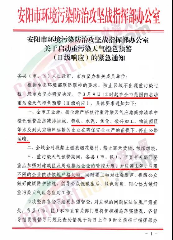 安陽(yáng)市環(huán)境污染防治攻堅(jiān)戰(zhàn)指揮部辦公室發(fā)布《關(guān)于啟動(dòng)重污染天氣橙色預(yù)警(Ⅱ級(jí)響應(yīng))的緊急通知》,要求于3月9日12時(shí)在全市范圍內(nèi)啟動(dòng)重污染天氣橙色預(yù)警(Ⅱ級(jí)響應(yīng))要求全市工業(yè)源、揚(yáng)塵源嚴(yán)格執(zhí)行重污染天氣應(yīng)急減排清單中橙色預(yù)警應(yīng)急減排措施。