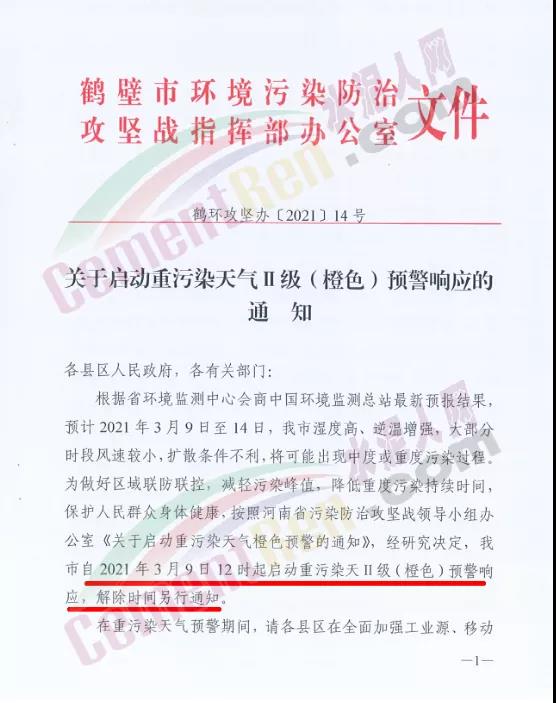 鶴壁市環(huán)境污染防治攻堅(jiān)戰(zhàn)指揮部辦公室發(fā)布《關(guān)于啟動(dòng)重污染天氣Ⅱ級(jí)(橙色)預(yù)警響應(yīng)的通知》自2021年3月9日12時(shí)起啟動(dòng)重污染天Ⅱ級(jí)(橙色)預(yù)警響應(yīng),解除時(shí)間另行通知。在重污染天氣預(yù)警期間,請(qǐng)各縣區(qū)在全面加強(qiáng)工業(yè)源、移動(dòng)源、揚(yáng)塵源污染管控,嚴(yán)格落實(shí)水泥和磚瓦窯企業(yè)錯(cuò)峰生產(chǎn)要求的同時(shí),鼓勵(lì)涉大宗物料運(yùn)輸企業(yè)在確保安全生產(chǎn)的前提下,停止公路運(yùn)輸。重型貨車(chē)及非道路移動(dòng)機(jī)械停運(yùn)管理、施工工地停工情況的督查力度。