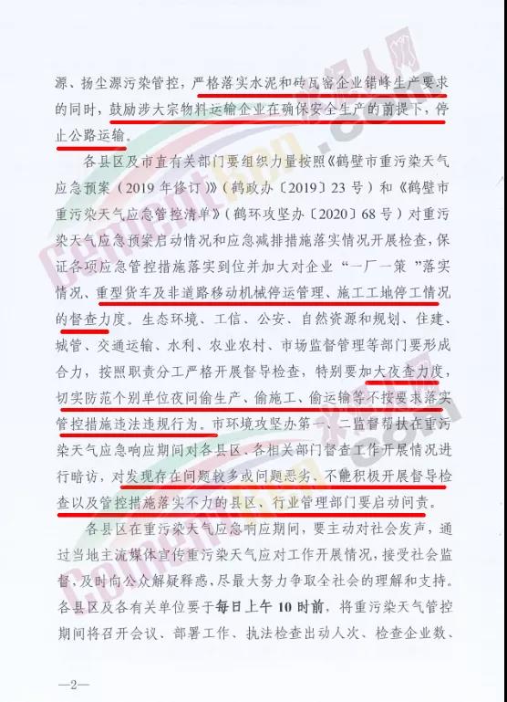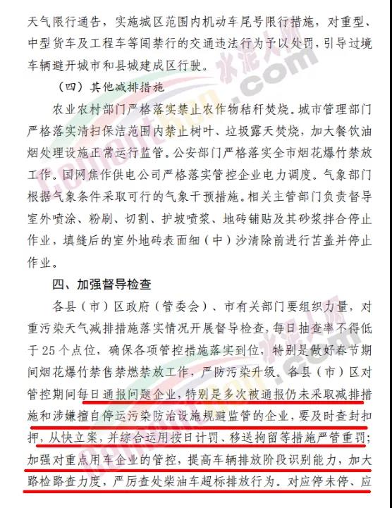 鋼鐵、水泥、焦化、破碎加工、物流園區(qū)等涉及到大宗物料運(yùn)輸?shù)钠髽I(yè)在確保安全生產(chǎn)的前提下,停止公路運(yùn)輸。重污染天氣預(yù)警期間,各縣(市、區(qū))、市直有關(guān)部門(mén)要重點(diǎn)加強(qiáng)對(duì)建成區(qū)及周邊排污企業(yè)的管控力度,對(duì)應(yīng)停未停、應(yīng)限不限的企業(yè)依法依規(guī)嚴(yán)格處理。