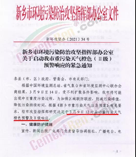 新鄉(xiāng)市環(huán)境污染防治攻堅(jiān)指揮部辦公室發(fā)布《關(guān)于啟動(dòng)新鄉(xiāng)市重污染天氣橙色(Ⅱ級(jí))預(yù)警響應(yīng)的緊急通知》稱(chēng)于3月9日12時(shí)啟動(dòng)重污染天氣橙色預(yù)警及Ⅱ級(jí)響應(yīng)。