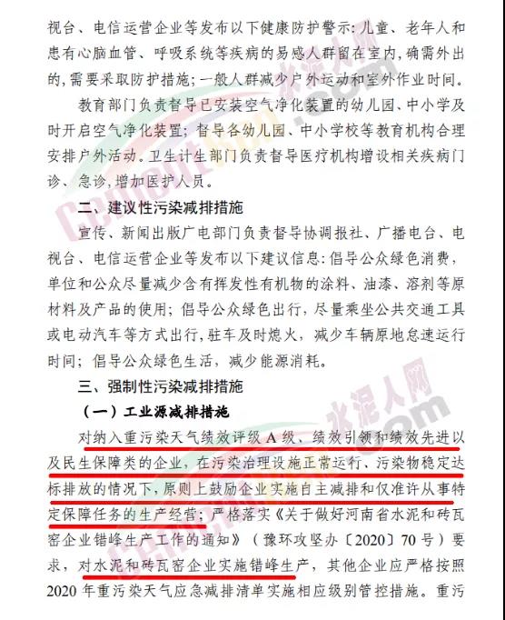 工業(yè)源減排措施要求對(duì)納入重污染天氣績(jī)效評(píng)級(jí)A級(jí)、績(jī)效引領(lǐng)和績(jī)效先進(jìn)以及民生保障類(lèi)的企業(yè),在污染治理設(shè)施正常運(yùn)行、污染物穩(wěn)定達(dá)標(biāo)排放的情況下,原則上鼓勵(lì)企業(yè)實(shí)施自主減排和僅準(zhǔn)許從事特定保障任務(wù)的生產(chǎn)經(jīng)營(yíng);嚴(yán)格落實(shí)《關(guān)于做好河南省水泥和磚瓦窯企業(yè)錯(cuò)峰生產(chǎn)工作的通知》(豫環(huán)攻堅(jiān)辦〔2020〕70號(hào))要求,對(duì)水泥和磚瓦窯企業(yè)實(shí)施錯(cuò)峰生產(chǎn),其他企業(yè)應(yīng)嚴(yán)格按照2020年重污染天氣應(yīng)急減排清單實(shí)施相應(yīng)級(jí)別管控措施。