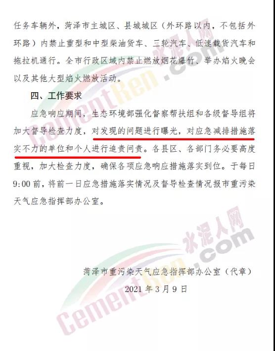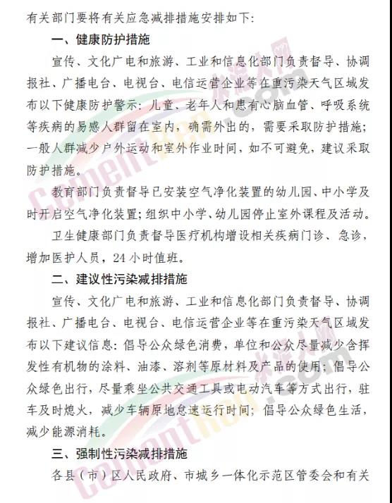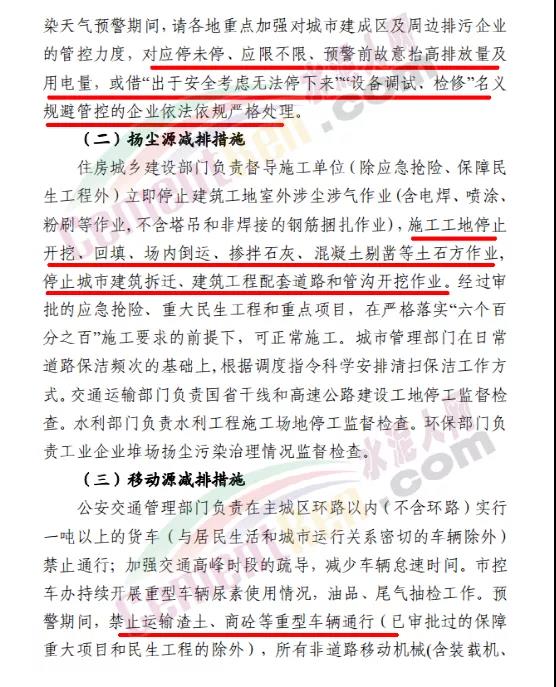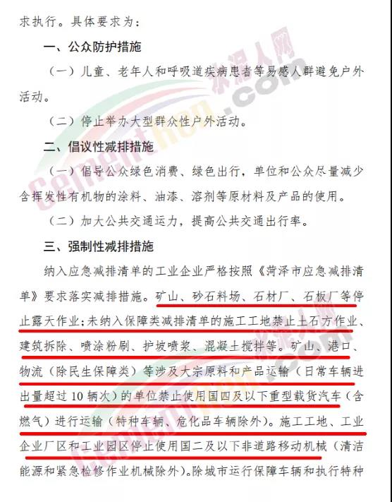 強(qiáng)制性減排措施要求納入應(yīng)急減排清單的工業(yè)企業(yè)嚴(yán)格按照《菏澤市應(yīng)急減排清單》要求落實(shí)減排措施。礦山、砂石料場(chǎng)、石材廠、石板廠等停止露天作業(yè);未納入保障類(lèi)減排清單的施工工地禁止土石方作業(yè)、建筑拆除、噴涂粉刷、護(hù)坡噴漿、混凝土攪拌等。礦山、港口、物流(除民生保障類(lèi))等涉及大宗原料和產(chǎn)品運(yùn)輸(的單位禁止使用國(guó)四及以下重型載貨汽車(chē)進(jìn)行運(yùn)輸。施工工地、工業(yè)企業(yè)廠區(qū)和工業(yè)園區(qū)停止使用國(guó)二及以下非道路移動(dòng)機(jī)械。