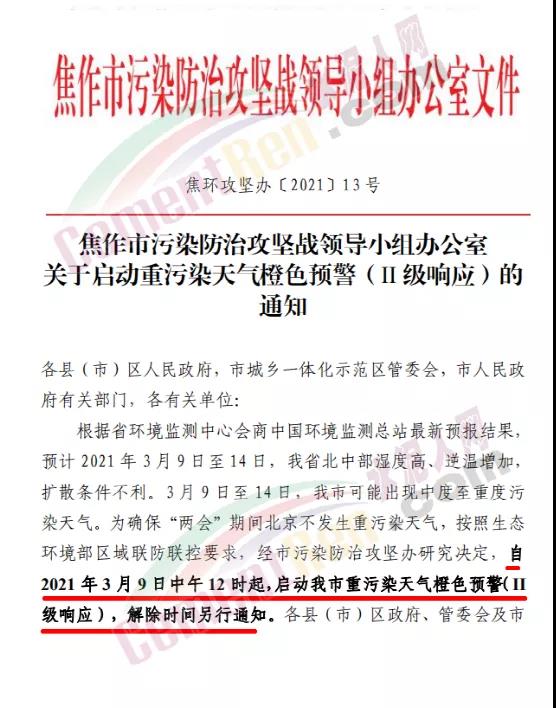 焦件市污染防治攻堅(jiān)戰(zhàn)領(lǐng)導(dǎo)小組辦公室文件發(fā)布《焦作市污染防治攻堅(jiān)戰(zhàn)領(lǐng)導(dǎo)小組辦公室關(guān)于啟動(dòng)重污染天氣橙色預(yù)警(Ⅱ級(jí)響應(yīng))的通知》稱(chēng)自2021年3月9日中午12時(shí)起,啟動(dòng)焦作市重污染天氣橙色預(yù)警(Ⅱ級(jí)響應(yīng)),解除時(shí)間另行通知。