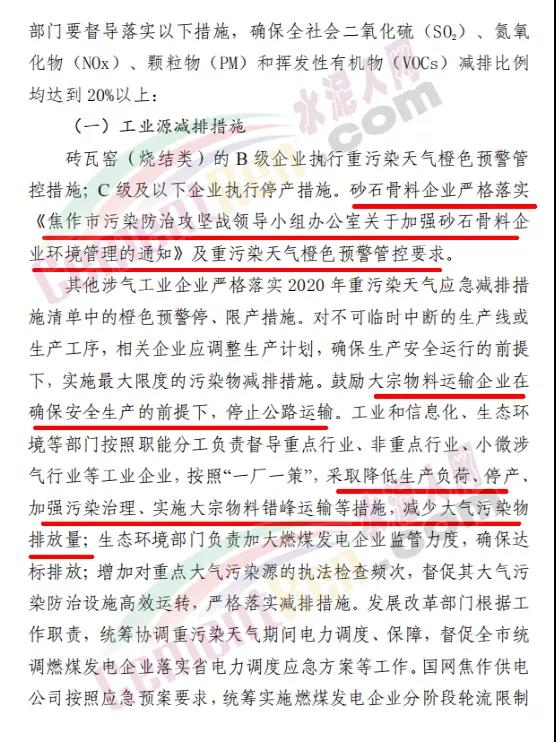 工業(yè)源減排措施要求磚瓦窯(燒結(jié)類(lèi))的B級(jí)企業(yè)執(zhí)行重污染天氣橙色預(yù)警管控措施;C級(jí)及以下企業(yè)執(zhí)行停產(chǎn)措施。砂石骨料企業(yè)嚴(yán)格落實(shí)《焦作市污染防治攻堅(jiān)戰(zhàn)領(lǐng)導(dǎo)小組辦公室關(guān)于加強(qiáng)砂石骨料企業(yè)環(huán)境管理的通知》及重污染天氣橙色預(yù)警管控要求。