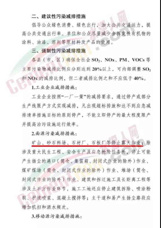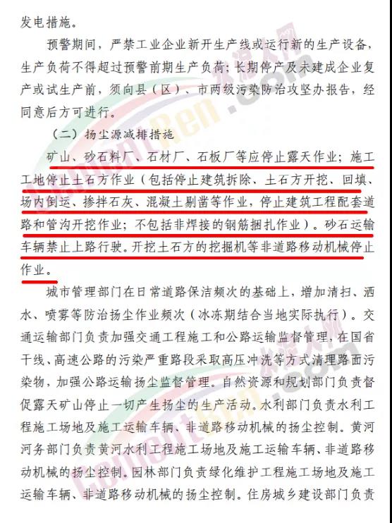 工業(yè)企業(yè)減排措施方面∶落實(shí)重污染天氣應(yīng)急預(yù)案、應(yīng)急減排清單確定的減排措施。揚(yáng)塵污染減排措施方面∶礦山、砂石料場(chǎng)、石材廠、石板廠等停止露天作業(yè);施工工地禁止土石方作業(yè)、建筑拆除、噴涂粉刷、護(hù)坡噴漿、混凝土攪拌等;