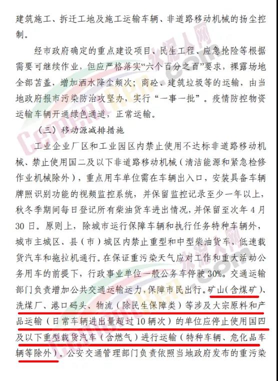 礦山(含煤礦)、洗煤廠、繞城高速公路以?xún)?nèi)及各區(qū)縣建成區(qū)的物流園區(qū)范圍內(nèi)的企業(yè)(民生保障類(lèi)除外)等涉及大宗原料和產(chǎn)品運(yùn)輸?shù)膯挝粦?yīng)停止使用國(guó)四及以下重型載貨汽車(chē)進(jìn)行運(yùn)輸。