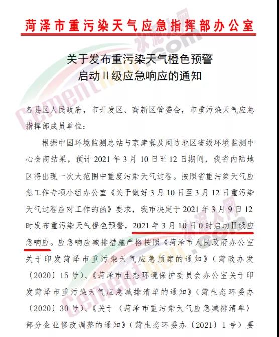 山東省菏澤市重污染天氣應(yīng)急指揮部辦公室發(fā)布《關(guān)于發(fā)布重污染天氣橙色預(yù)警啟動(dòng)Ⅱ級(jí)應(yīng)急響應(yīng)的通知》稱(chēng)于2021年3月9日12時(shí)發(fā)布重污染天氣橙色預(yù)警,2021年3月10日0時(shí)啟動(dòng)Ⅱ級(jí)應(yīng)急響應(yīng)。
