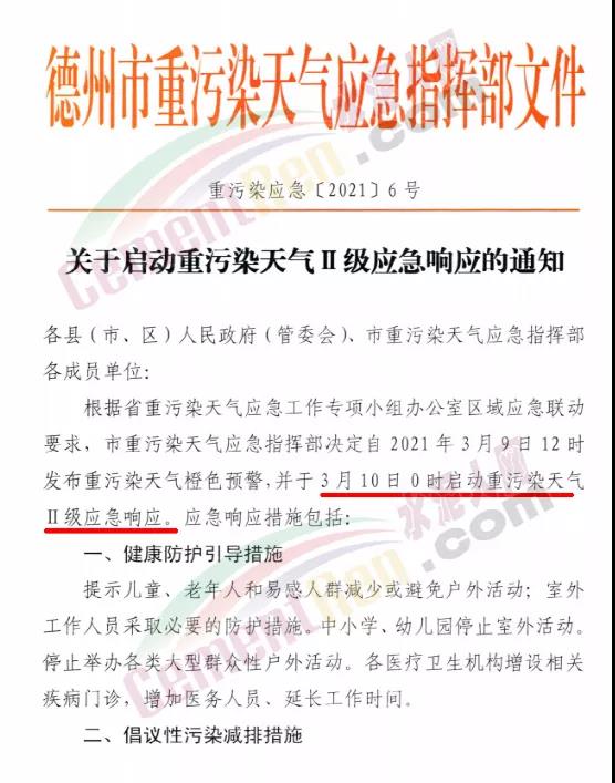 山東德州市重污染天氣應(yīng)急指揮部發(fā)布《關(guān)于啟動(dòng)重污染天氣Ⅱ級(jí)應(yīng)急響應(yīng)的通知》要求自3月10日0時(shí)啟動(dòng)重污染天氣Ⅱ級(jí)應(yīng)急響應(yīng)。
