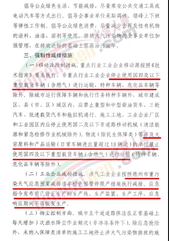 工業(yè)企業(yè)減排措施。涉氣工業(yè)企業(yè)按照德州市重污染天氣應(yīng)急預(yù)案減排清單橙色預(yù)警停限產(chǎn)措施執(zhí)行減排。應(yīng)急指令發(fā)布前已停止生產(chǎn)的生產(chǎn)線、生產(chǎn)裝置、生產(chǎn)工序,應(yīng)急響應(yīng)期間不得恢復(fù)生產(chǎn)。