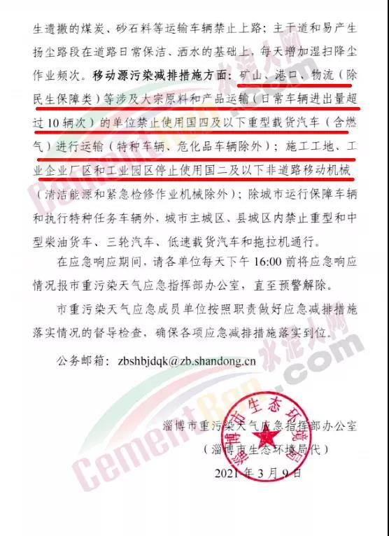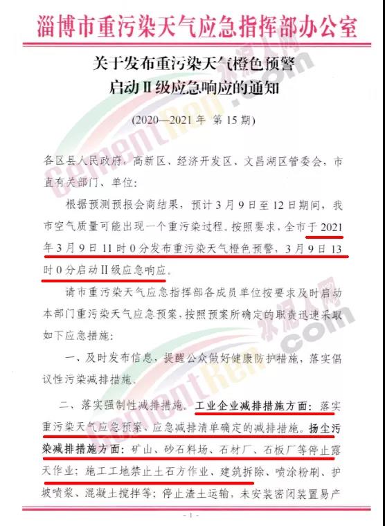 淄博市重污染天氣應(yīng)急指揮部辦公室發(fā)布《關(guān)于發(fā)布重污染天氣橙色預(yù)警啟動(dòng)Ⅱ級(jí)應(yīng)急響應(yīng)的通知》稱(chēng)按照要求,全市于2021年3月9日11時(shí)0分發(fā)布重污染天氣橙色預(yù)警,3月9日13時(shí)0分啟動(dòng)Ⅱ級(jí)應(yīng)急響應(yīng)。請(qǐng)市重污染天氣應(yīng)急指揮部各成員單位按要求及時(shí)啟動(dòng)本部門(mén)重污染天氣應(yīng)急預(yù)案,按照預(yù)案所確定的職責(zé)迅速采取如下應(yīng)急措施∶