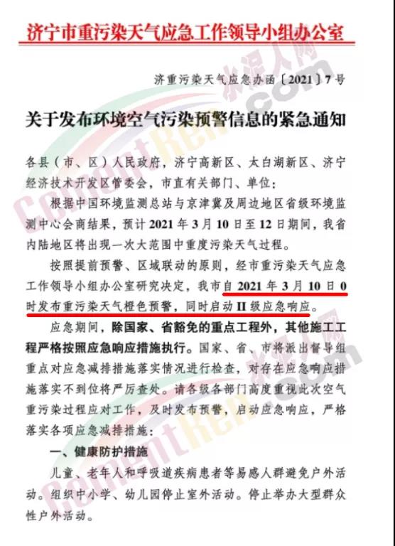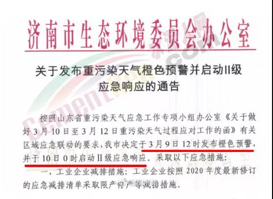 濟(jì)寧市自2021年3月10日0時(shí)發(fā)布重污染天氣橙色預(yù)警,同時(shí)啟動(dòng)II級(jí)應(yīng)急響應(yīng)。