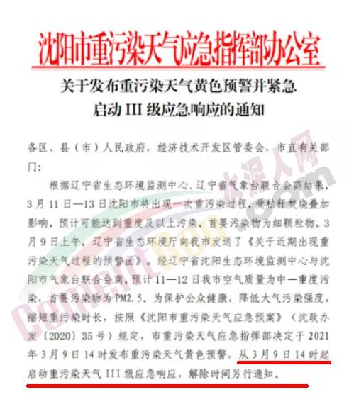 根據(jù)遼寧省生態(tài)環(huán)境廳《關(guān)于近期出現(xiàn)重污染天氣過(guò)程的預(yù)警函》提示,經(jīng)遼寧省生態(tài)環(huán)境監(jiān)測(cè)中心、遼寧省氣象臺(tái)聯(lián)合會(huì)商,2021年3月11日-13日大氣擴(kuò)散條件較為不利,受秸稈焚燒疊加影響,預(yù)計(jì)我市將出現(xiàn)一次重污染過(guò)程。經(jīng)遼寧省沈陽(yáng)生態(tài)環(huán)境監(jiān)測(cè)中心與沈陽(yáng)市氣象臺(tái)聯(lián)合會(huì)商,預(yù)計(jì)11—12日我市空氣質(zhì)量為中—重度污染,首要污染物為PM2.5。為了做好重污染天氣應(yīng)對(duì)工作,保障公眾健康,按照《沈陽(yáng)市重污染天氣應(yīng)急預(yù)案》(沈政辦發(fā)〔2020〕35號(hào))規(guī)定,市重污染天氣應(yīng)急指揮部決定于3月9日14時(shí)發(fā)布重污染天氣黃色預(yù)警,并于14時(shí)緊急啟動(dòng)Ⅲ級(jí)應(yīng)急響應(yīng)。