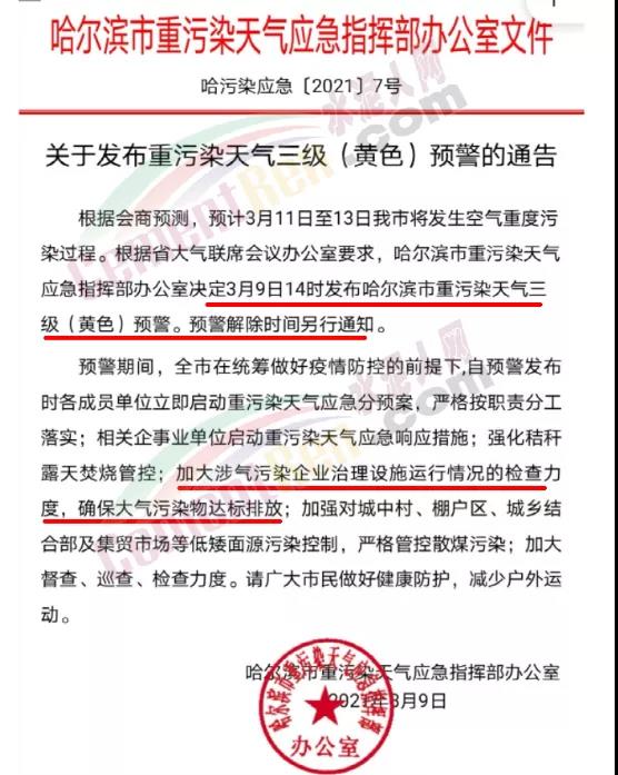 根據(jù)《哈爾濱市重污染天氣應(yīng)急預(yù)案(2020年修訂)》規(guī)定,哈爾濱市重污染天氣應(yīng)急指揮部辦公室決定3月9日14時(shí)發(fā)布哈爾濱市重污染天氣三級(jí)(黃色)預(yù)警。