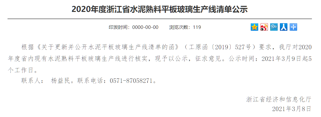 日前,浙江省經濟和信息化廳發布《2020年度浙江省水泥熟料平板玻璃生產清單公示》。公示時間為2021年3月9日起5個工作日。