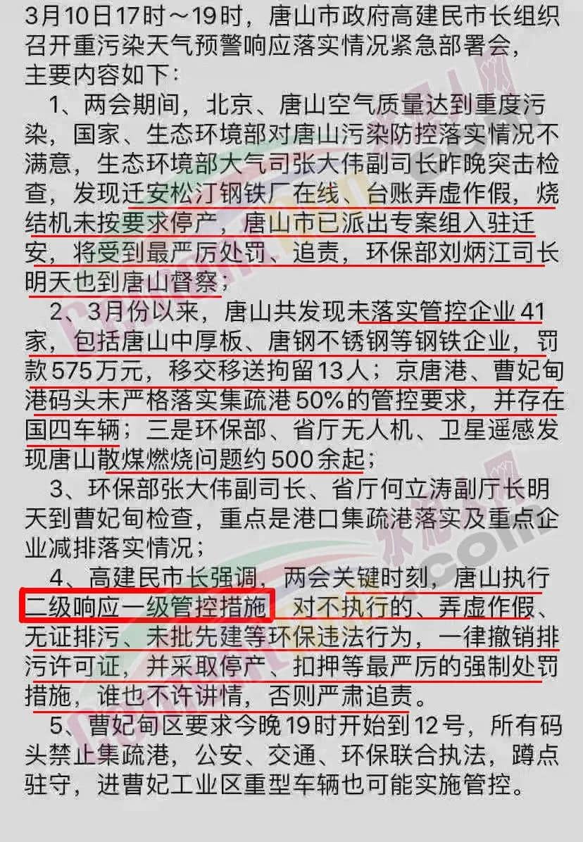 高建民市長(zhǎng)在布署會(huì)上提到,3月份以來(lái),唐山共發(fā)現(xiàn)未落實(shí)管控企業(yè) 41家,包括唐山中厚板、唐鋼不銹鋼等鋼鐵企業(yè),罰款575萬(wàn)元,移交移送拘留13人;京唐港、曹妃甸港碼頭未嚴(yán)格落實(shí)集疏港50%的管控要求,并存在國(guó)四車輛;生態(tài)環(huán)境部、省廳無(wú)人機(jī)、衛(wèi)星遙感發(fā)現(xiàn)唐山散煤燃燒問(wèn)題約 500余起。
