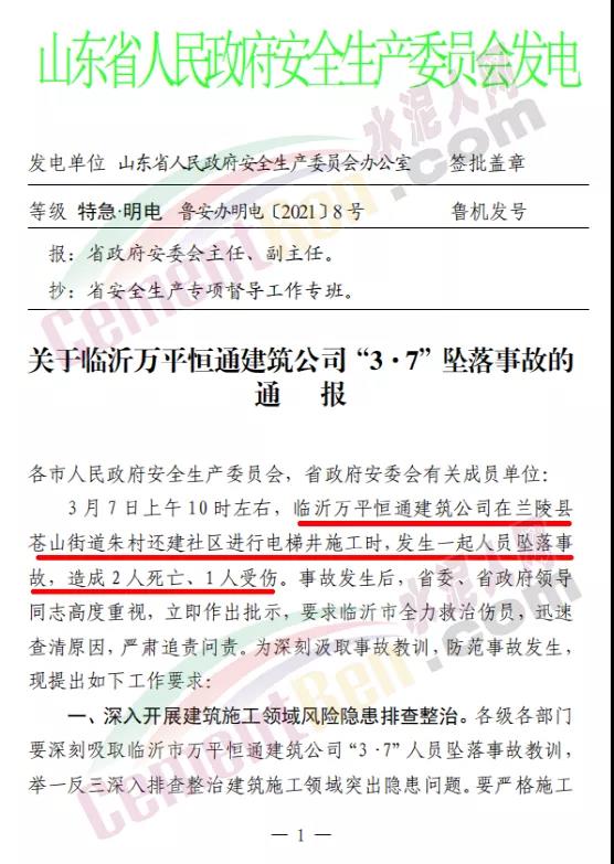 日前,山東省政府安委會發特急明電《關于臨沂萬平恒通建筑公司“3·7”墜落事故的通報》稱,3月7日上午10時左右,臨沂萬平恒通建筑公司在蘭陵縣蒼山街道朱村還建社區進行電梯井施工時,發生一起人員墜落事故,造成2人死亡、1人受傷。