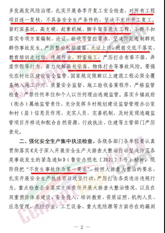 各級各部門要深刻吸取臨沂市萬平恒通建筑公司“3·7”人員墜落事故教訓,舉一反三深入排查整治建筑施工領域突出隱患問題。要嚴格施工多發高發風險治理,扎實開展春季開復工安全檢查,對所有工程項目逐一復核,不具備安全生產條件的,堅決不允許開工復工。