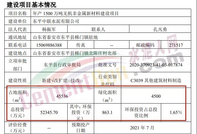 據(jù)水泥人網(wǎng)了解,東平中聯(lián)水泥有限公司無機非金屬新材料建設(shè)項目位于山東省泰安市東平縣梯門鎮(zhèn)北陳莊村北部,總投資 52345.70 萬元,其中環(huán)保投資 863.1 萬元,占總投資比例的1.65%,項目占地面積 45536平方米,綠化面積4500平方米。預(yù)計投產(chǎn)日期為2021年7月。