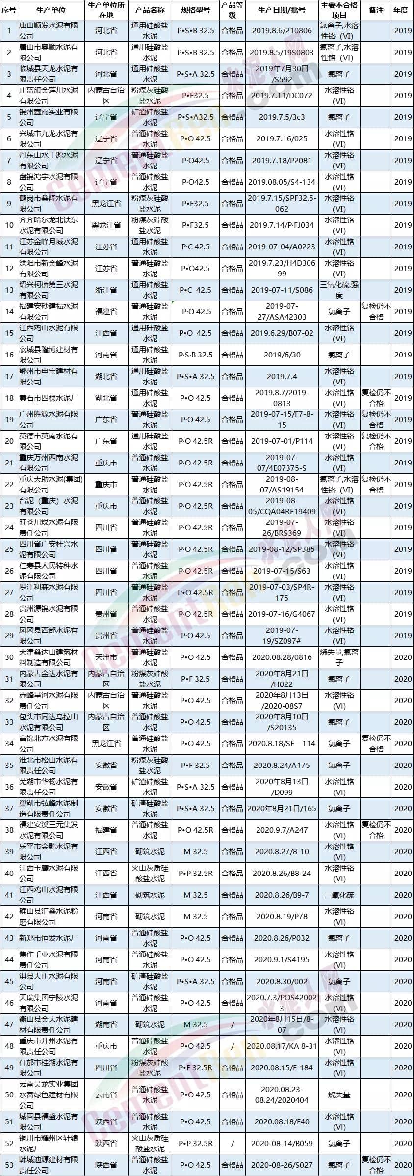 2020年水泥產(chǎn)品抽查了27個(gè)省(區(qū)、市)439家企業(yè)生產(chǎn)的440批次水泥產(chǎn)品,其中24批次產(chǎn)品不合格,不合格發(fā)現(xiàn)率為5.5%。不合格項(xiàng)目涉及三氧化硫、氯離子、燒失量、水溶性鉻(Ⅵ)。2019年抽查了30個(gè)省(區(qū)、市)349家企業(yè)生產(chǎn)的349批次水泥產(chǎn)品,其中30批次產(chǎn)品不合格,不合格發(fā)現(xiàn)率為8.6%。不合格項(xiàng)目涉及三氧化硫、氯離子、強(qiáng)度、水溶性鉻(Ⅵ)。