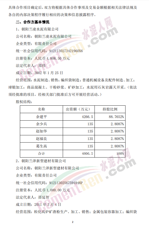 各方確認,待余建平及重組方將合作資產完成重組后,持股公司將持有蘭凌水泥100%股權,并通過蘭凌水泥持有蘭澤建材100%股權和亞鱷水泥90%股權。即,重組方歸屬于持股公司的總資產估值為10.75億。各方確認,重組方本次擬納入合作的水泥項目資產范圍包括但不限于: