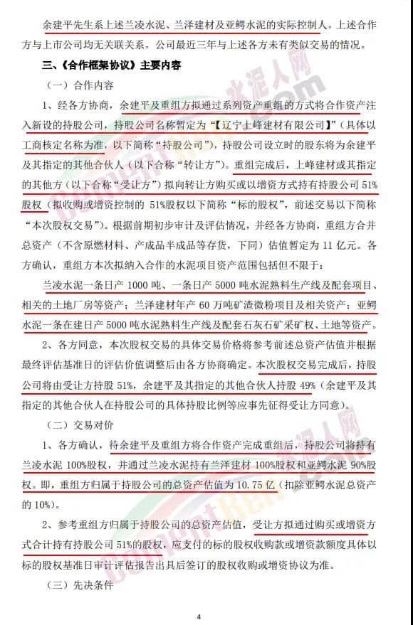 日前,上峰水泥發布《關于擬簽訂<合作框架協議>的公告》稱,公司全資子公司上峰建材擬與余建平及其控制的蘭凌水泥、蘭澤建材、亞鱷水泥簽訂《合作框架協議》,其中,蘭凌水泥、蘭澤建材及亞鱷水泥將通過系列資產重組的方式將合作資產注入新設公司,未來,上峰建材擬通過收購或增資方式控制新設公司51%股權。
