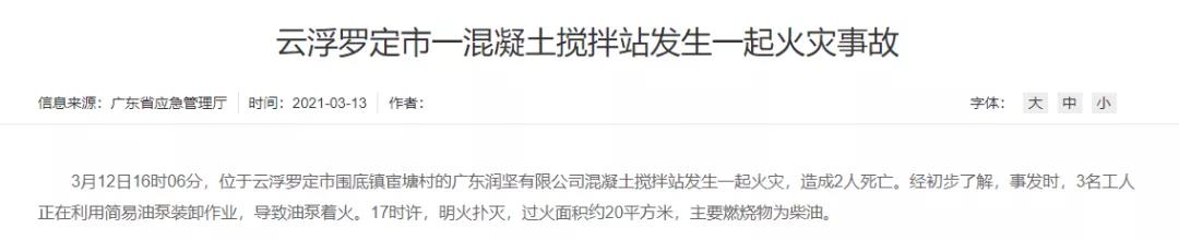 廣東省應急管理廳消息,3月12日16時06分,位于廣東省云浮羅定市圍底鎮宦塘村的廣東潤堅有限公司混凝土攪拌站發生一起火災,造成2人死亡。經初步了解,事發時,3名工人正在利用簡易油泵裝卸作業,導致油泵著火。17時許,明火撲滅,過火面積約20平方米,主要燃燒物為柴油。