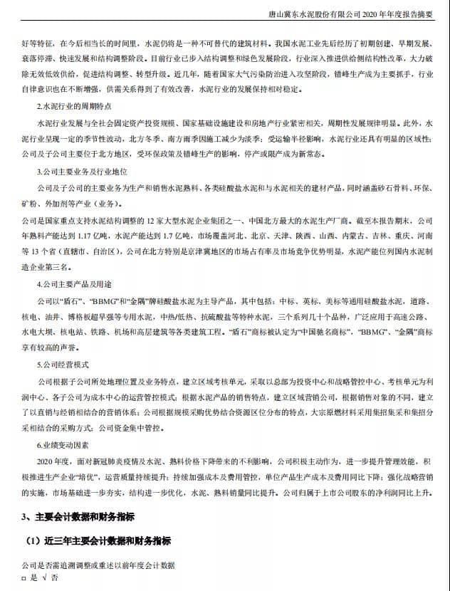 2020 年度,面對新冠肺炎疫情及水泥、熟料價格下降帶來的不利影響,公司積極主動作為,進一步提升管理效能,積極推進生產企業“培優”,運營質量持續提升;持續加強成本及費用管控,單位產品生產成本及費用同比下降;強化戰略營銷的實施,市場基礎進一步夯實,結構進一步優化,水泥、熟料銷量同比提升。公司歸屬于上市公司股東的凈利潤同比上升。