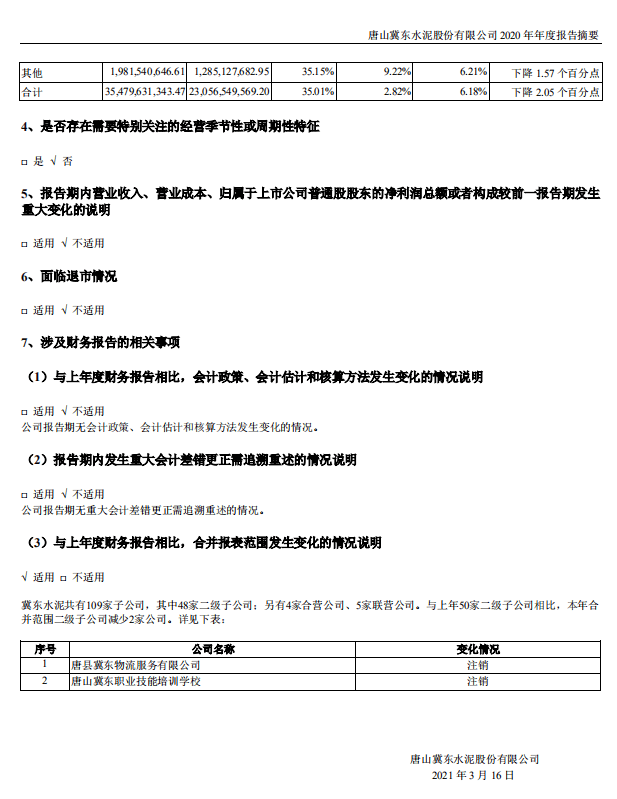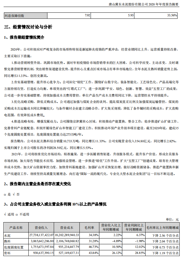 3月16日,冀東水泥發布了2020年年報。公司實現營業收入354.8億元,同比增長2.82%;凈利潤28.5億元,同比增長5.53%。公司水泥及熟料綜合銷量10733萬噸,同比增長11.33%。