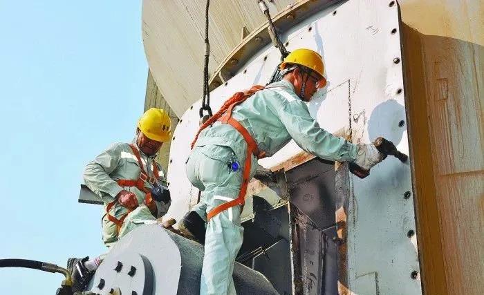 工人們戴著安全設(shè)備,在高空對立磨進行檢修