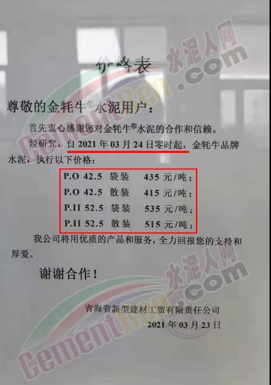 青海省新型建材工貿(mào)有限責(zé)任公司通知自3月24日零時(shí)起,金牦牛品牌水泥執(zhí)行新價(jià)格,PO42.5散裝報(bào)價(jià)415元/噸,P.II52.5散裝水泥報(bào)價(jià)515元/噸。