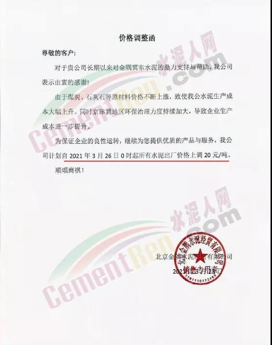 北京金隅水泥經(jīng)貿(mào)有限公司通知自3月26日起所有水泥出廠價(jià)上調(diào)20元/噸。