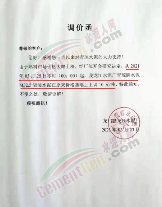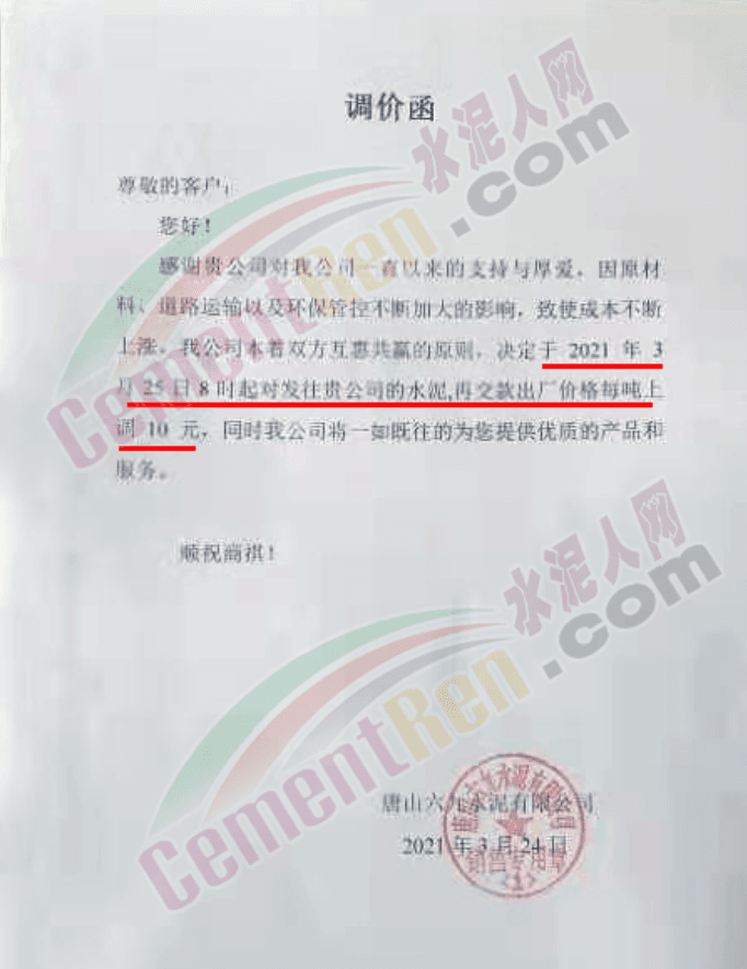 唐山弘也水泥通知因煤炭、石灰石等原材料價(jià)格不斷上漲,致使公司水泥生產(chǎn)成本大幅上升。同時(shí)京津冀地區(qū)環(huán)保治理力度持續(xù)加大,導(dǎo)致公司生產(chǎn)成本進(jìn)一步提升。為保證公司的良性運(yùn)轉(zhuǎn),自 2021年3月26日零點(diǎn)起所有水泥出廠價(jià)格統(tǒng)一上調(diào) 20元/噸。
