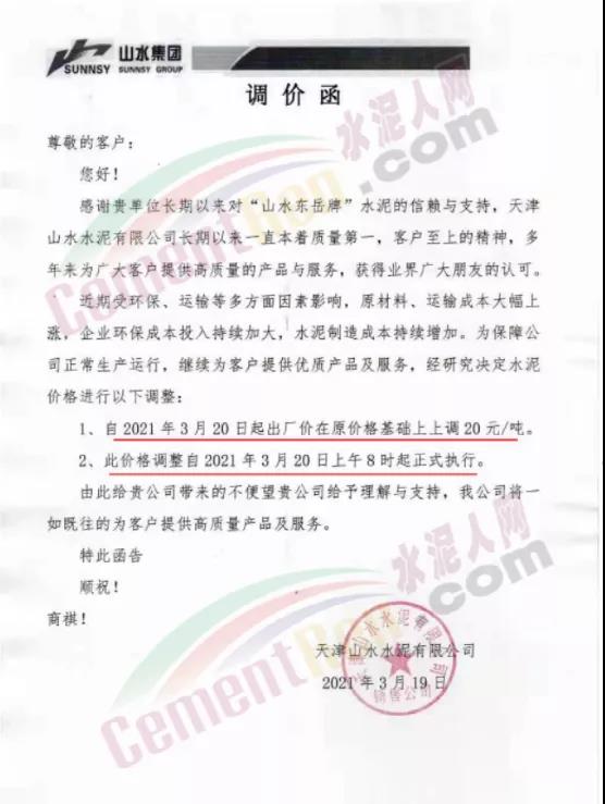 天津山水水泥有限公司通知,自3月20日起各標(biāo)號(hào)水泥出廠價(jià)上調(diào)20元/噸。