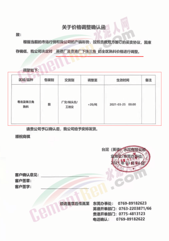 同期,英德臺(tái)泥也通知上調(diào)英德廠及貴港廠下珠三角的全區(qū)熟料價(jià)格20元/噸。