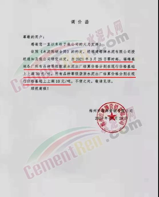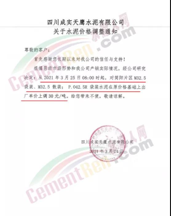 近期,因市場原因,經(jīng)研究決定,自2021年3月26日零時(shí)起,各品種散、袋水泥在原有價(jià)格基礎(chǔ)上上調(diào)30元/噸。