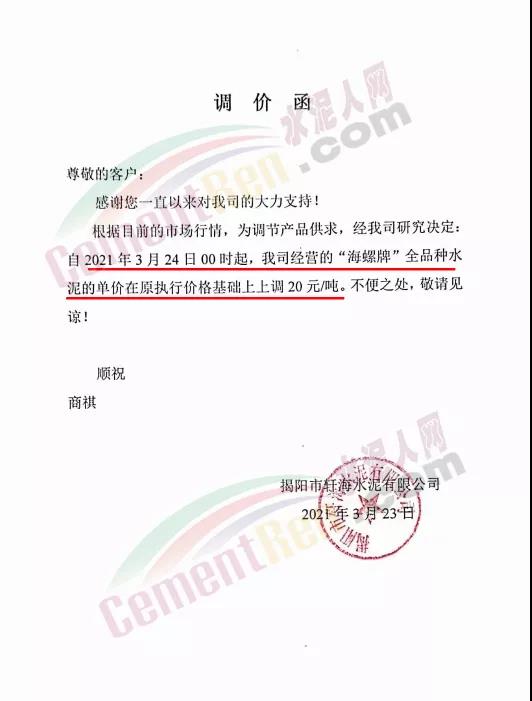 揭陽市軒海水泥有限公司通知,自3月24日零時(shí)起,公司經(jīng)營的“海螺牌”全品種水泥上調(diào)20元/噸。