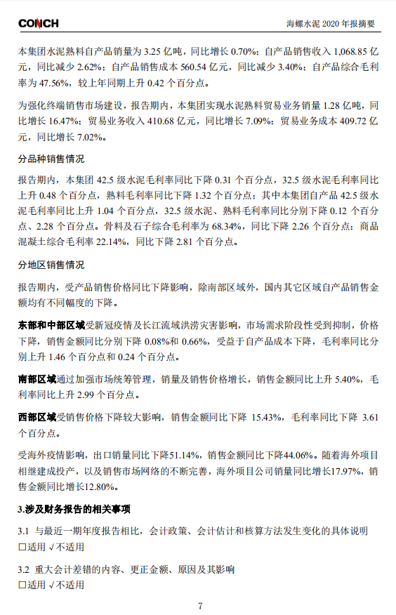報告期內,本集團42.5級水泥毛利率同比下降0.31個百分點,32.5級水泥毛利率同比上升0.48個百分點,熟料毛利率同比下降1.32個百分點;其中本集團自產品42.5級水泥毛利率同比上升1.04個百分點,32.5級水泥、熟料毛利率同比分別下降0.12個百分點、2.28個百分點。骨料及石子綜合毛利率為68.34%,同比下降2.26個百分點;商品混凝土綜合毛利率22.14%,同比下降2.81個百分點。