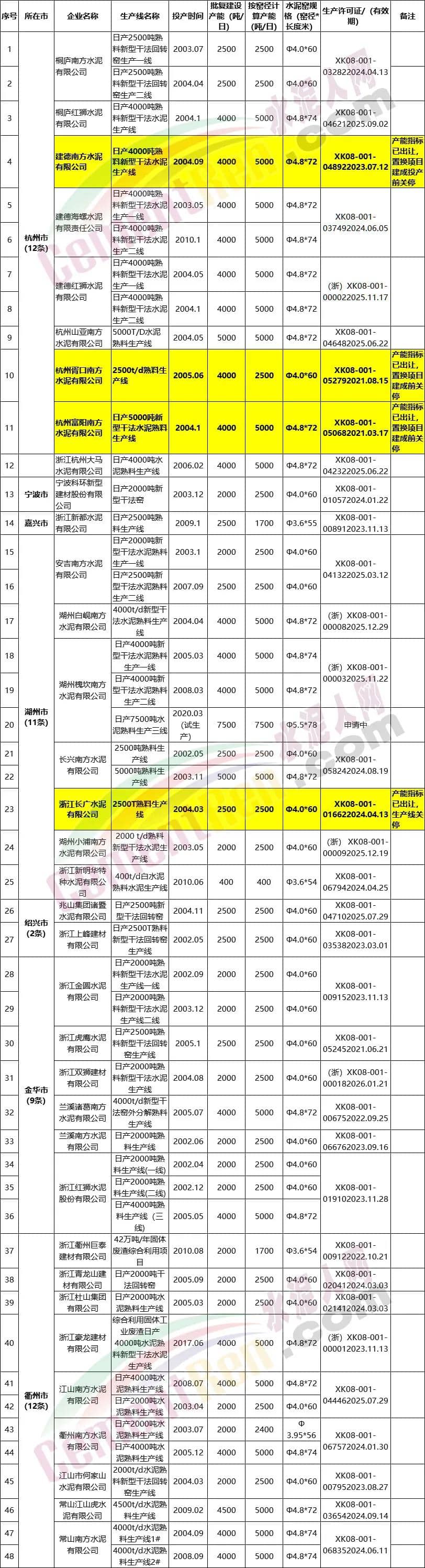 浙江省2020年度水泥熟料生產線清單