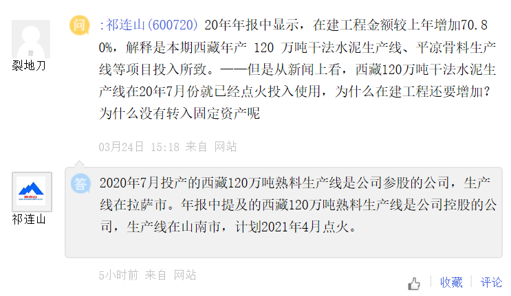上市公司祁連山(600720)回復稱,2020年7月投產的西藏120萬噸熟料生產線是公司參股的公司,生產線在拉薩市。年報中提及的西藏120萬噸熟料生產線是公司控股的公司,生產線在山南市,計劃2021年4月點火。