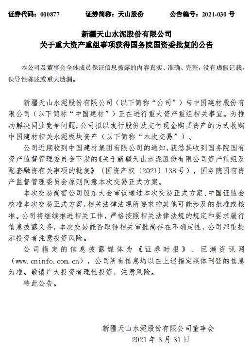 公司近期收到中國建材的通知,獲悉其收到國務院國資委下發的《關于新疆天山水泥股份有限公司資產重組及配套融資有關事項的批復》,國務院國資委原則同意本次交易正式方案。