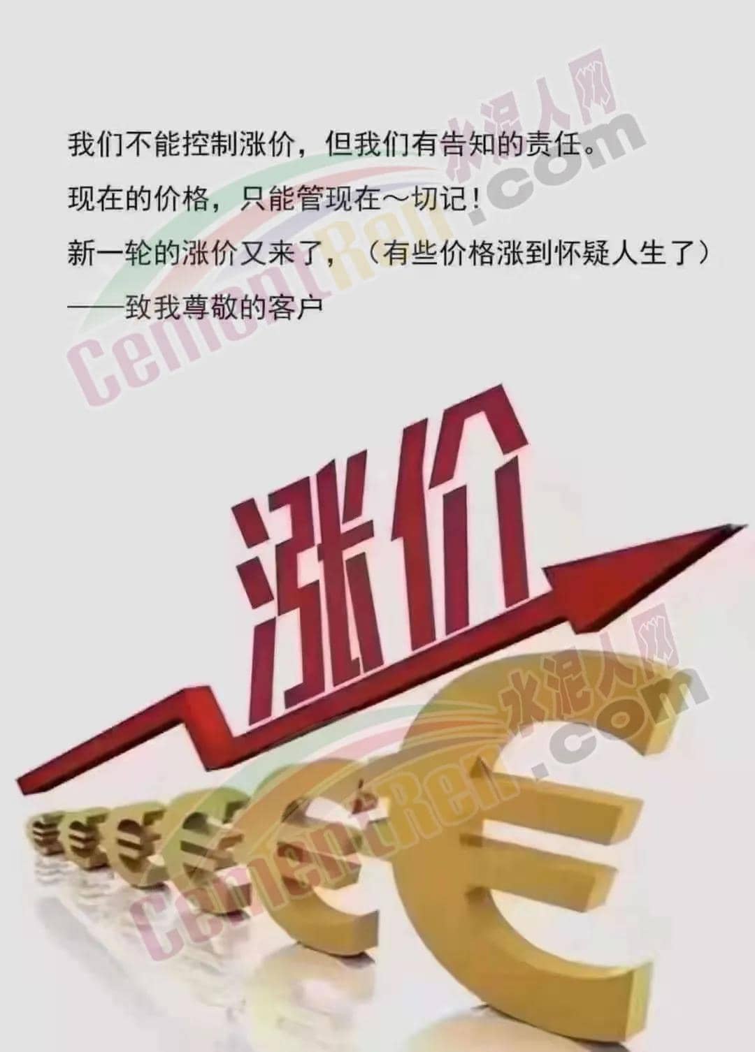 有水泥經銷商發(fā)致客戶稱:“我們不能控制漲價,但我們有告知的責任。現(xiàn)在的價格,只能管現(xiàn)在~切記!新一輪漲價又來了,有些價格漲到開始懷疑人生了!”