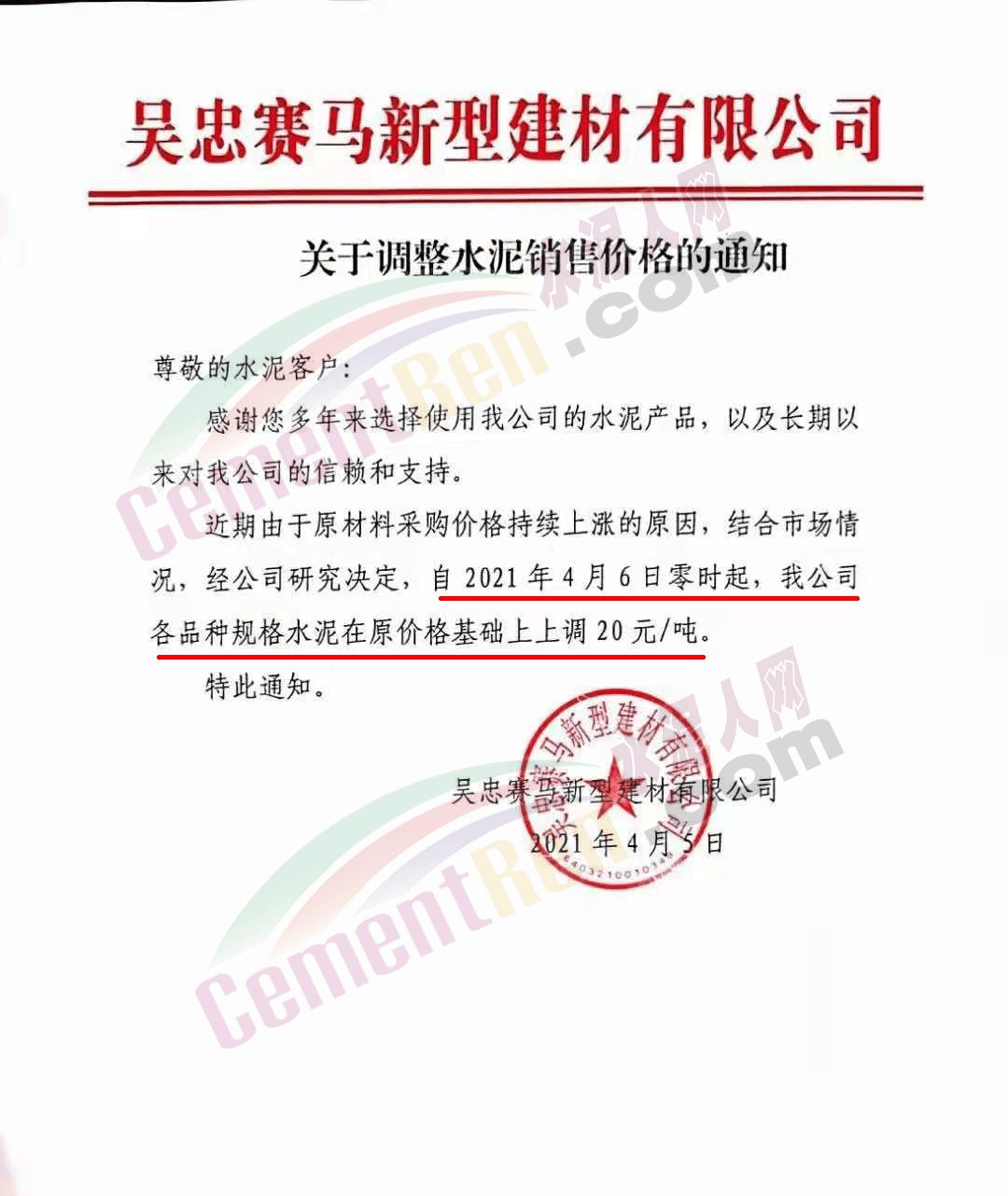 寧夏吳忠賽馬新型建材有限公司通知,由于原材料采購價格持續(xù)上漲的原因,結合市場情況,經公司研究決定 ,自4月6日零時起,公司各品種規(guī)格水泥在原價基礎上上調20元/噸。
