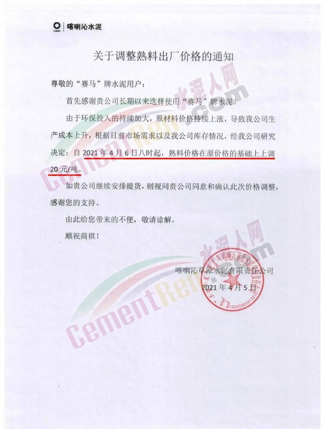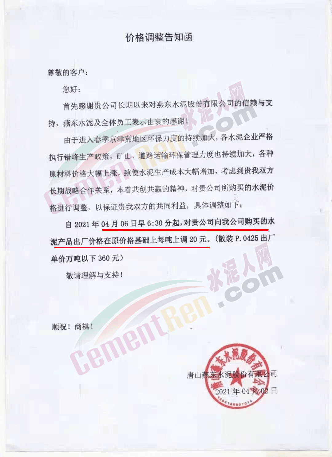 尊敬的客戶:根據目前市場行情,經公司研究決定,自2021年4月8日零時起我司發(fā)往各區(qū)域的各品種各型號水泥出廠單價上調40元/噸 。