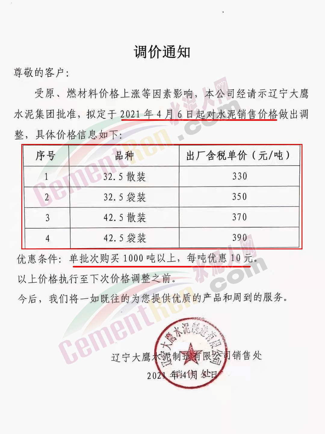 遼寧大鷹水泥制造有限公司銷售處通知,受原、燃材料價格上漲等因素影響,定于4月6日起對水泥銷售價格做出調整。調整后32.5袋裝水泥出廠含稅價350元/噸,42.5散裝水泥出廠含稅價370元/噸。單次購買1000噸以上,優(yōu)惠10元/噸。