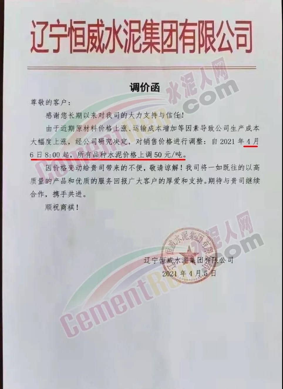 遼寧恒威水泥集團通知,由于近期原材料價格上漲,運輸成本增加等因素導致公司生產成本大幅度上漲,經公司研究決定,對銷售價格進行調整,自4月6日8時起,所有品種水泥價格上調50元/噸。